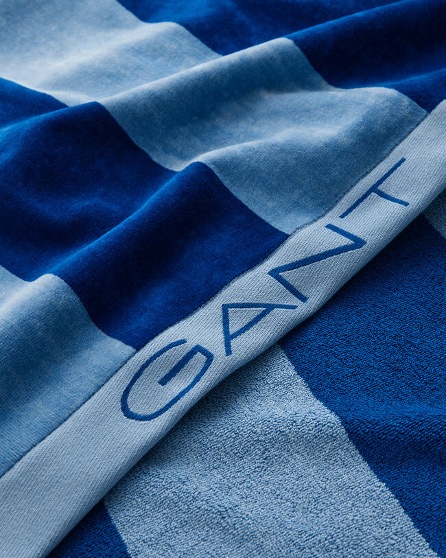 Designed with bold stripes for a nautical touch, this beach towel is the perfect summertime accessory for pool days, beach days and more. Cut from certified organic cotton, this reversible towel has a soft velour side and an absorbent and thick terry cloth side with a 500g/m2 weight. It features a jacquard GANT logo at the bottom edge.